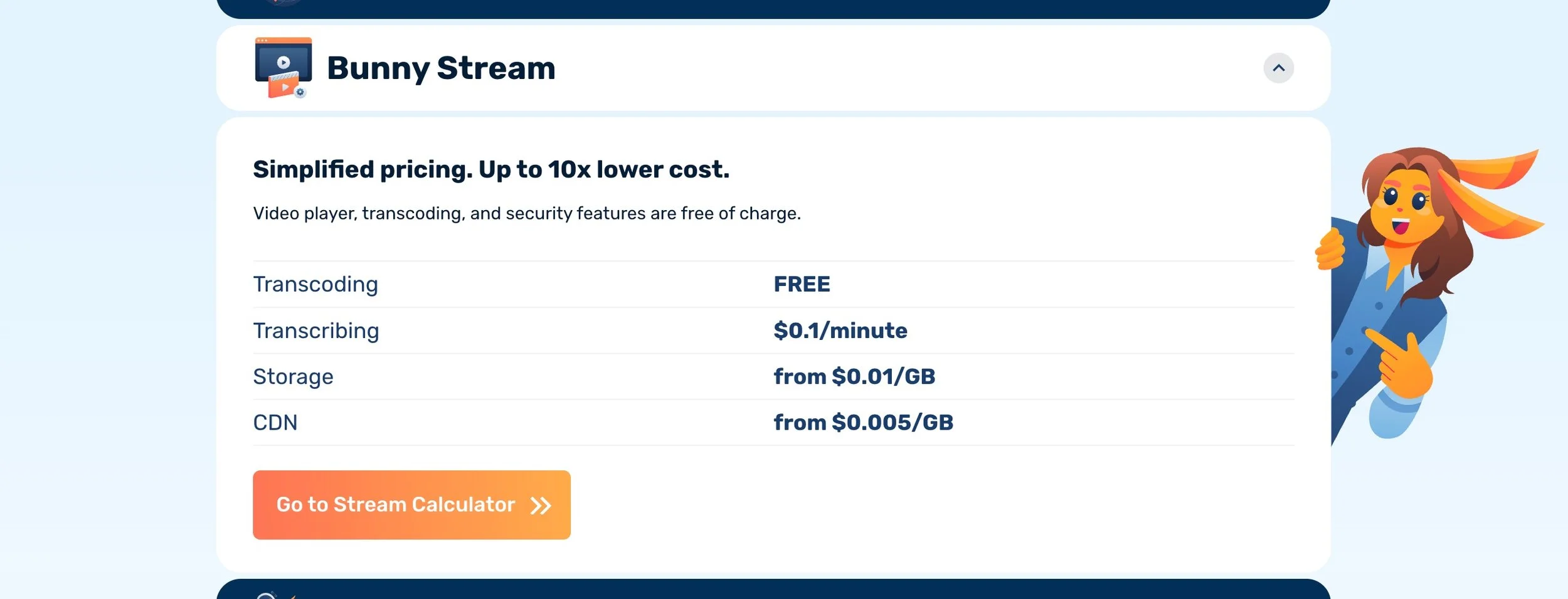 For me, the biggest appeal of Bunny Stream is that you only pay for what you use (with a minimum charge of $1/month), unlike traditional platforms like Vimeo that operate on fixed subscription tiers.